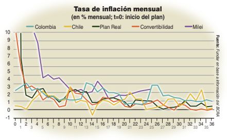 El efecto de un ancla cambiaria se puede ilustrar comparando la dinámica de diversos programas de estabilización. Cuando estos usan el tipo de cambio como ancla, y cuando el punto de partida es una inflación muy alta, el poder coordinador del plan tiende a ser mayor. Se puede comparar el caso argentino a partir de 2023, con dos tipos de programas: los de shock (la Convertibilidad argentina lanzada en marzo de 1991 y el Plan Real brasileño en julio de 1994) y los abordajes “gradualistas” (la experiencia de Chile y Colombia desde 1991). Para facilitar la comparación, las series arrancan con cada programa y se extienden hasta tres años después (excepto para el programa argentino más reciente, porque recién van dos años desde su implementación).