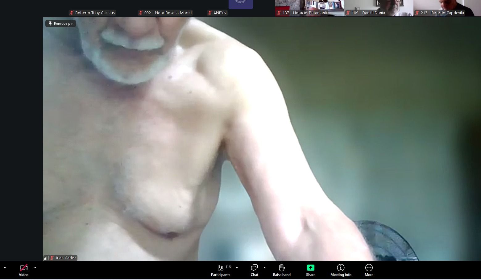 El reportero acompañó el mensaje con una seguidilla de imágenes en la que se ven a los disertantes presenciando el encuentro virtual en situaciones inapropiadas. Desde señores mayores con el torso descubierto, hasta recostados en la cama o sentados en el inodoro, fueron captados por la cámara de sus propias computadoras.