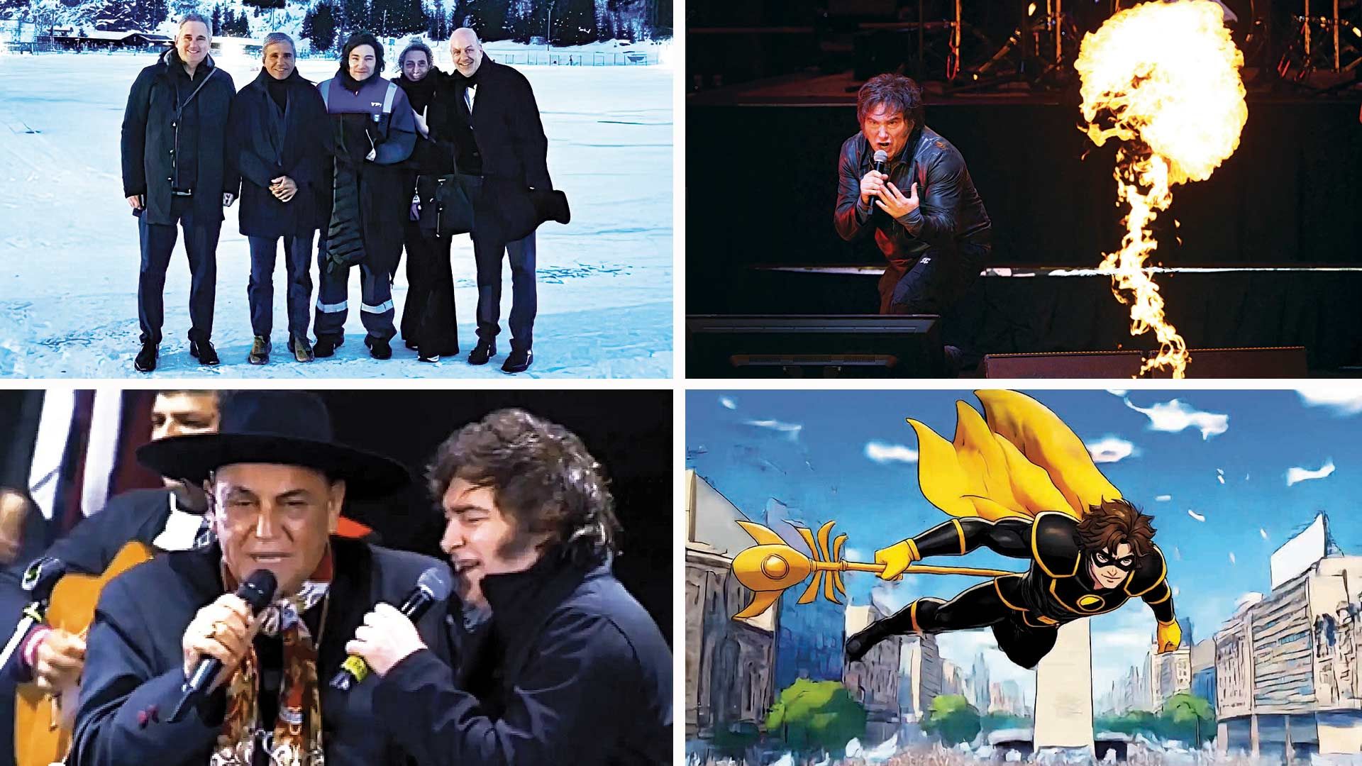 Mientras por un lado agita la violencia con invitaciones permanentes a “odiar más” y compara a sus rivales con monos o cucarachas, por el otro ofrece circo: el recital en el Movistar Arena, su show en el festival de Jesús María, una aparición en un canal de streaming oficialista junto a su perro clonado, un beso fogoso con su entonces pareja en un teatro costero, cuadros en la Quinta de Olivos donde se compara con Wolverine y con un león, una bizarra cuenta en inglés presentada mediante un cómic donde aparece volando sobre Buenos Aires como superhéroe. A esta lista se suma su escasa preocupación por la higiene y el recambio de vestuario —con el mameluco de YPF como emblema, incluso en Davos— y su llanto desconsolado en el Muro de los Lamentos, una postal inédita para un presidente argentino.
